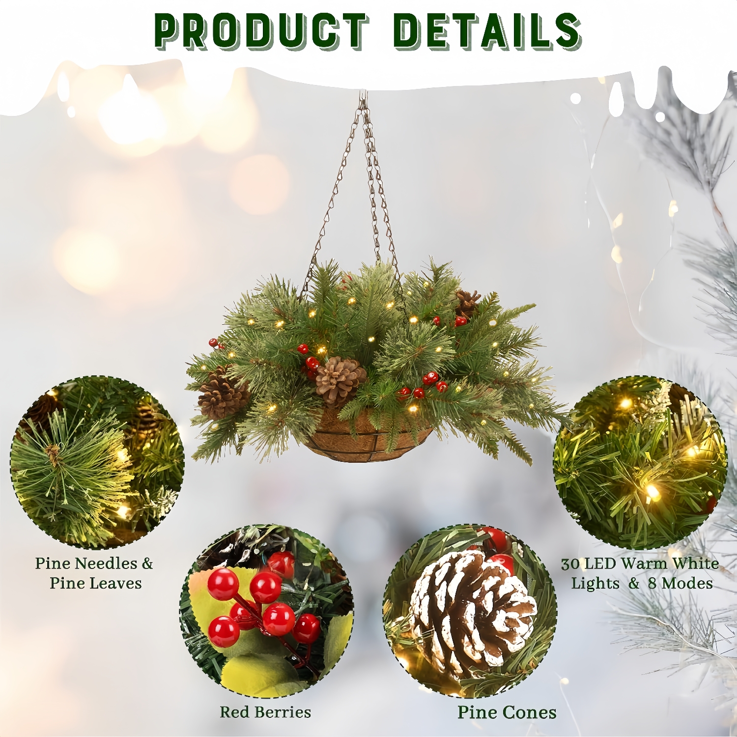 Christmas hanging basket trimmed with green leaves, red berries, pine cones, snow and 30 LED lights (need to install battery, battery is not included), Christmas hanging baskets are great for decorating your front porch, entrance, window cornice, balcony garden at your home front door or anywhere, creating a joyful and cozy holiday atmosphere, making your home the most eye-catching place.