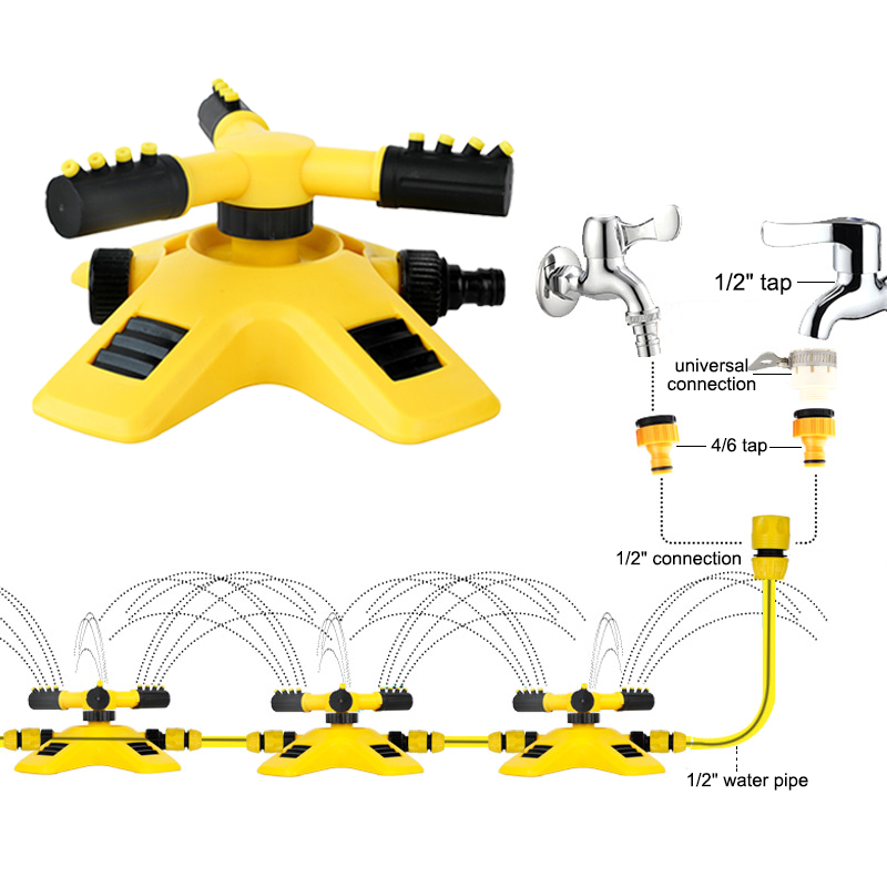 - [360-degree Rotation] Three-arm and 360-degree rotating garden sprinklers give your yard maximum water exposure and cool down on hot sunny days.